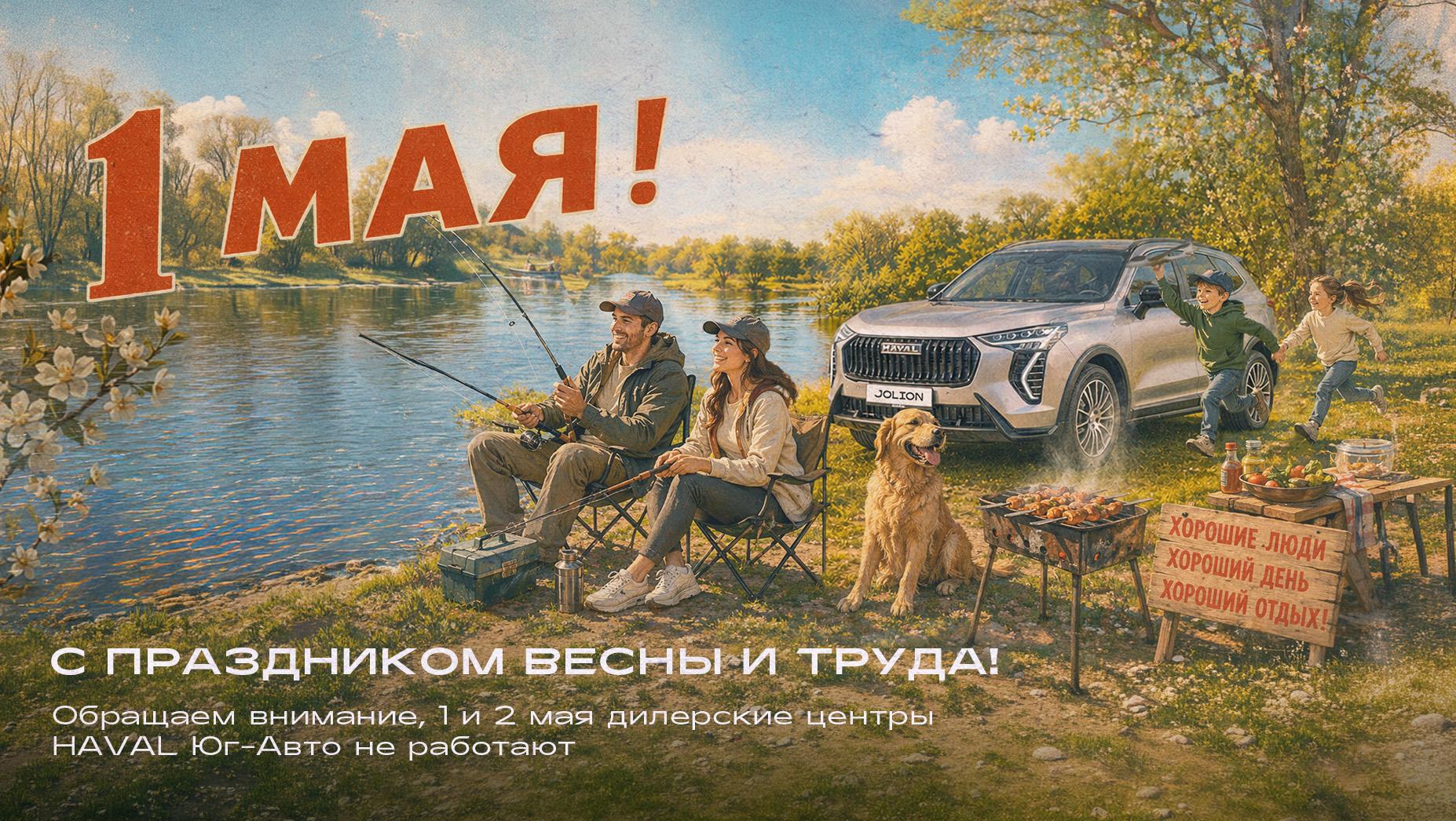 Поздравляем с праздником мира и труда! Пускай этот весенний праздник подарит отличное настроение, вдохновение и много радостных минут! От души желаем Вам плодотворных и насыщенных будней, чудесного и полноценного отдыха, весеннего настроения и множество счастливых событий. Обращаем внимание, что 1 и 2 мая дилерские центры HAVAL Юг-Авто не работают.